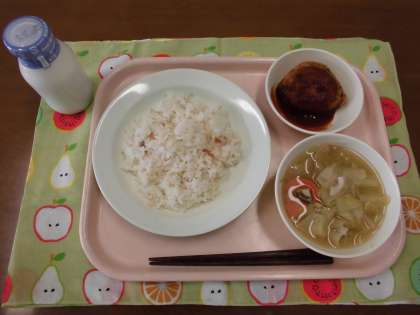 梅じゃこごはん・牛乳・魚のメンチカツ・五目野菜汁 です。