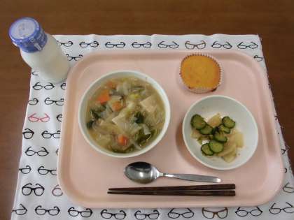 ちゃんぽんうどん・牛乳・大根ときゅうりの中華味・キャロットケーキ