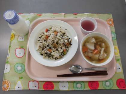 磯おこわ・牛乳・けんちん汁・ぶどうゼリー です。