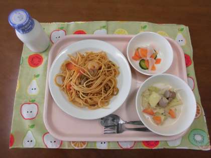 スパゲティーナポリタン・牛乳・ミルクポトフ・ピクルス風 です。