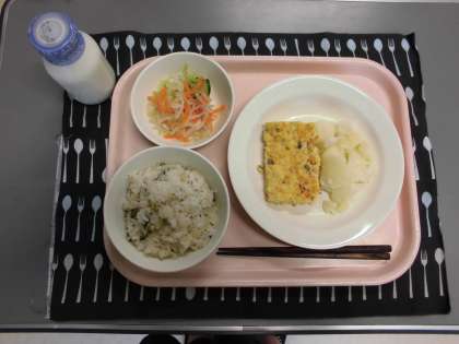 菜めし・牛乳・チーズ入り卵焼き・粉ふきいも・野菜の甘酢あえ