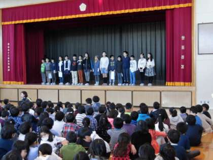 図書委員の児童が、図書室のマナーや不明本に関するクイズや、図書室にある本の内容のクイズなどを考え、全校に向けて出題しました。ちなみに、中丸小学校の蔵書数は、およそ何冊でしょう。