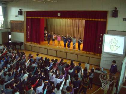 集会委員会の子どもたちや先生方がしっかりと準備をし、全校の子どもたちを楽しませました。