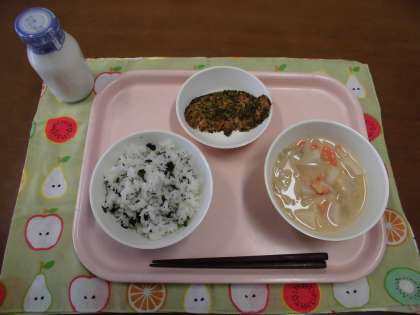 わかめごはん・牛乳・魚の香味焼き・豆乳汁 です。