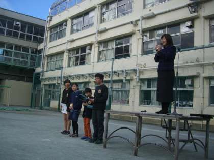 2学期に行われた水泳記録会、連合運動会、長なわチャレンジ、バスケットボールのがんばりを称え、表彰がありました。