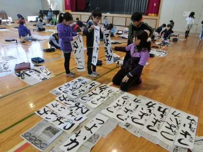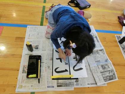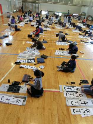 今日は3年生の書き初め大会でした。体育館で一斉に半紙に向かいました。子ども達は4枚書き、枚数を追うごとに上達が見られました。初めての書き初め大会に子ども達は緊張しながら、自分と向き合いながら取り組みました。
