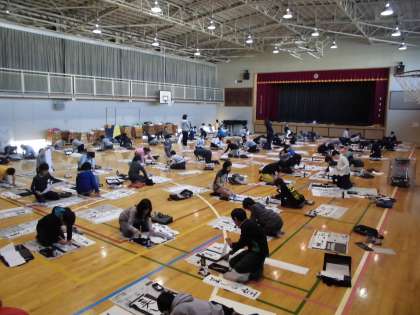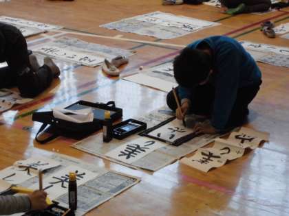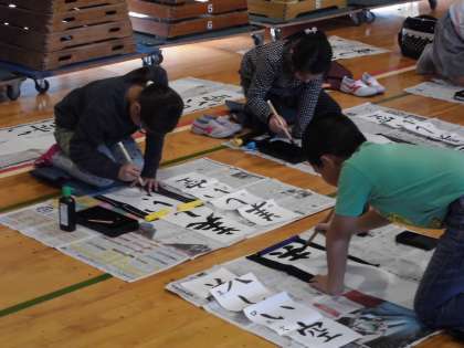 誰一人大きな声を出すことなく、しーんと静まり返った体育館で、集中して一画一画を丁寧に書いていました。二学期よりもとても上手になっていて、冬休みのお家での練習の成果がはっきりと見られました。