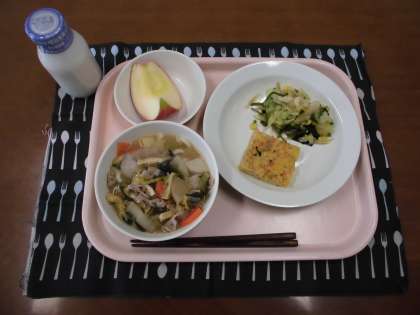 みそ煮込みうどん・牛乳・糸寒天サラダ・千草蒸し・果物(りんご)