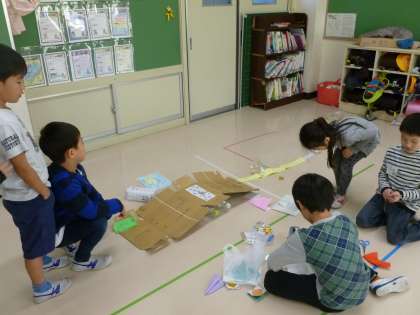 当日は、6〜8グループに分かれ、それぞれが考えたおもちゃを用意して、1年生に遊んでもらいました。「楽しかった!」「もっとやりたい!」という1年生の声を聞いて、笑顔になった2年生でした。