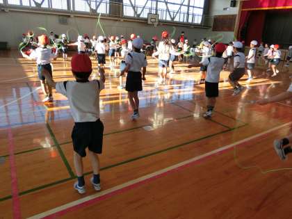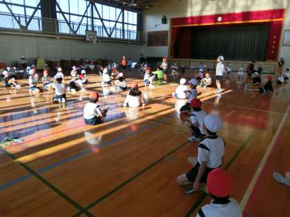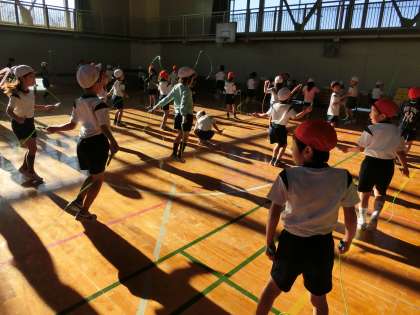 1年生は体育館で前跳び、後ろ跳び、チャレンジで交差跳び、あや跳びを跳んだ後、前跳びをたくさん跳べるかを競争いました。