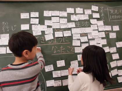 「1年生から今までにどんなことがあった?」と聞くと、入学式、初めての給食、プールが大きくて怖かった、学芸会緊張した! とたくさんの意見が出てきました。この2年間で自分が成長したこと、できるようになったことをカードに書き、黒板に貼って共有しました。