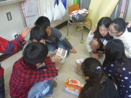 自分たちのもっている箱がどのような形なのか、グループに分かれて試行錯誤しながら話し合っています。