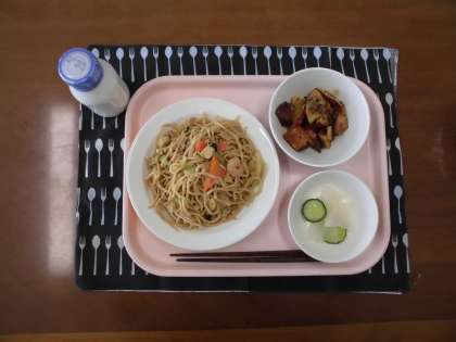 海鮮焼きそば・牛乳・大根の甘酢づけ・りんご入り大学芋 です。