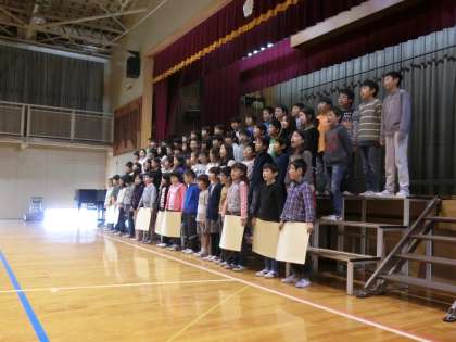 トップバッターの5年生の迫力におされ、子どもたちは緊張気味。そのあとの、1年生の可愛らしい発表を見た後で、いよいよ3年生の番になりました。