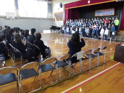 体育館では、スライドショーから始まり、群読、呼びかけ、合唱など自分たちが学習してきた力を、十分に発揮することができました。