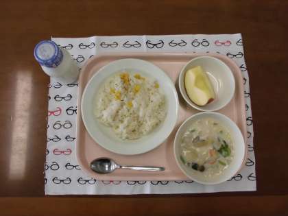 コーンライス・牛乳・森のチャウダー・果物(りんご) です。