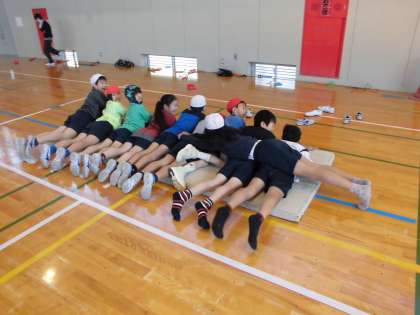 4年生は男女の仲も非常によく、一緒に運動することも抵抗なくできます。マットでは、技というよりも、「男女仲よく、一緒に楽しむこと」をテーマに、運動をしました。