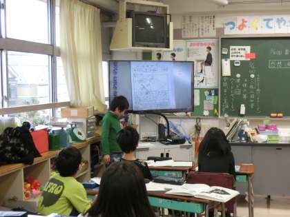 完成したカードは、実物投影機で映して全体で発表しました。知らなかった道具やその使い方を知ることができました。