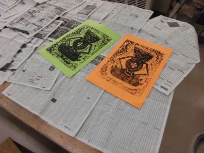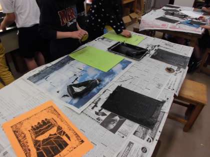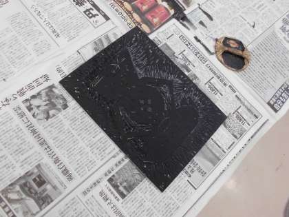 今回はそれにインクを塗り、版画に取り組みました。インクを塗っても、端までしっかり押していないと紙に上手に写らず、かすれてしまいます。
