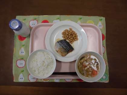 ごはん・牛乳・魚のみそ煮・ぶどう豆・のっぺい汁 です。
