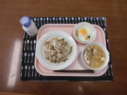 五目ごはん・牛乳・巣ごもり卵・白菜とベーコンのスープ です。