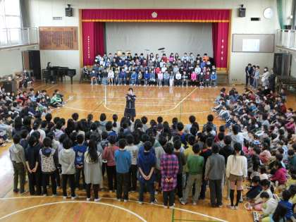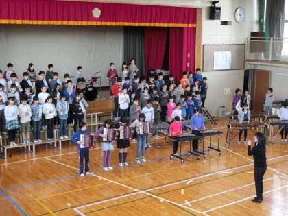 下級生の各学年からの出し物(歌や楽器演奏)のあと、6年生からの演奏の出し物があり特に「情熱大陸」では全校児童が盛り上がりました。舞台上の6年生は下級生の呼びかけや演奏に熱心に耳を傾け、とても素晴らしい会となりました。