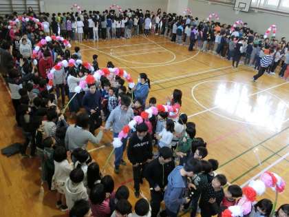 6年生を送る会を、体育館で行いました。在校生が6年生の思い出に残る楽しいひと時になるように活動を工夫し、お世話になった6年生への感謝の気持ちを伝えること、卒業生は下級生の温かい気持ちを受け取り、6年生としての責任や仕事を引き継ぎ、学校の伝統をつなぐことを目的とした会です。
