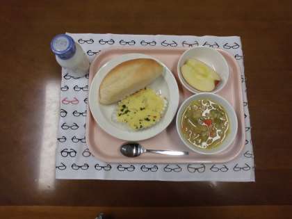 ソフトフランスパン・牛乳・フレンチエッグ・ABCスープ です。