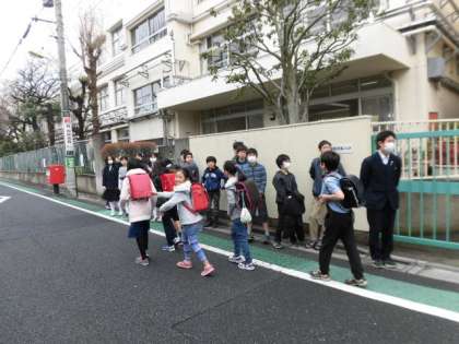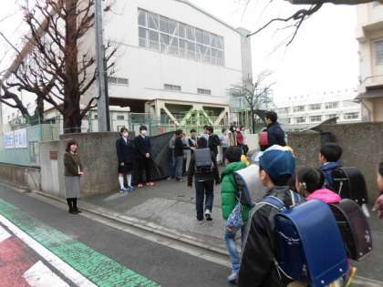 響きの学び舎、駒留中学校の生徒会長さん、副生徒会長さん、書記の3人が、中丸小学校に「あいさつ隊」として、朝早くから、来校してくれました。子どもたちは、制服姿の大きなお兄さん、お姉さんに、やや気後れしながらも、元気な声に応えるように、大きな声で気持ちよくあいさつができました。