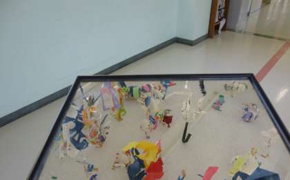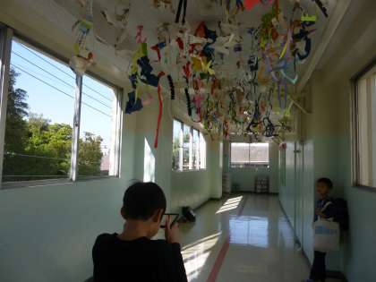 脚立を使って、どんどん2年生の廊下に作品をとめていきました。