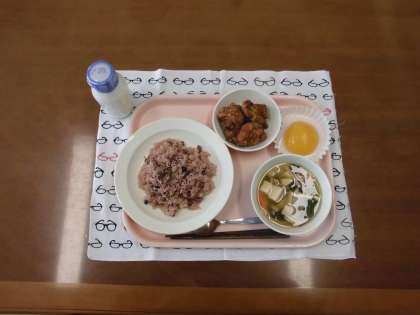 赤飯・牛乳・鶏肉の唐揚げ・沢煮碗・おかしなおかしな目玉焼き
