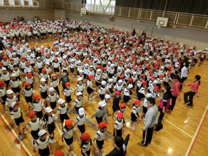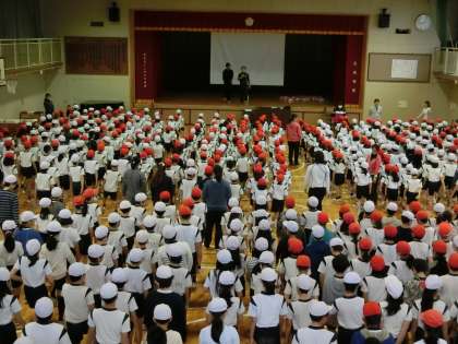 今年度初の体育朝会が体育館で行われました。今日は行進の練習をしました。練習をしているうちにだんだんうまくなり、列が揃ってきました。一斉に揃うととてもかっこいいです。