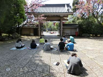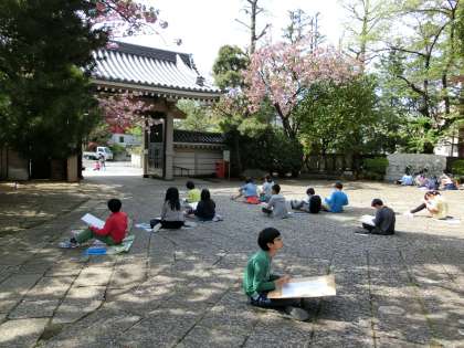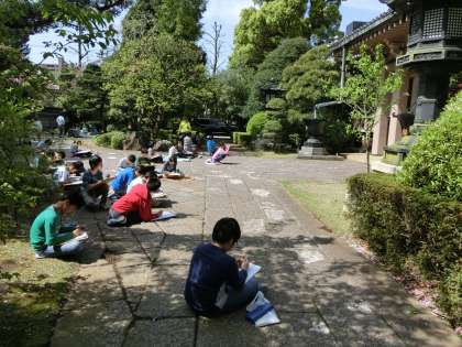 6年生が図工の時間に龍雲寺へ行き、スケッチをしました。境内や参門や庭など、それぞれ好きな場所を見つけて描きました。次回の図工の時間から和紙に本日、写生をした絵を写し取り、墨で描く作業に入ります。