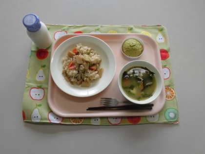 中華おこわ・牛乳・わかめスープ・抹茶ケーキ です。