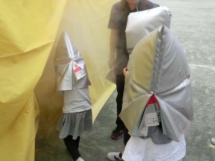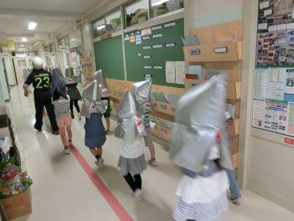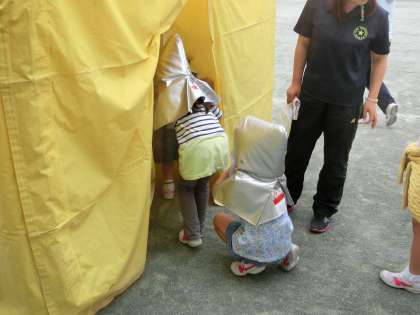 今日は避難訓練で煙中訓練がありました。火事では煙の被害が多いため、煙の中を歩く訓練をしました。煙の中を歩く3つの注意事項、口と鼻をおおうこと、腰を低くして移動すること、壁をつたいながら移動することを学びました。