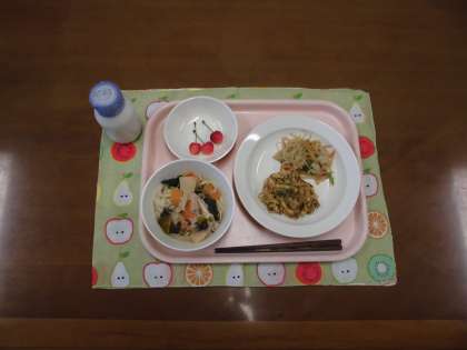 煮込みうどん・牛乳・かき揚げ・野菜のおかか和え・果物(さくらんぼ)