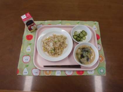 そぼろごはん・りんごジュース・みそ汁・きゅうりの甘酢づけ です。