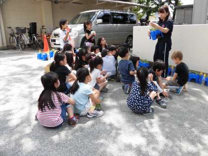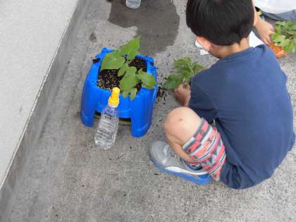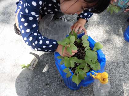 1年生が植えたあさがおが、日に日に大きく生長しています。毎日、水やりを欠かさない1年生です。たくさんの芽が出たあさがおの間引きをしました。夏に花が咲くのが楽しみです。