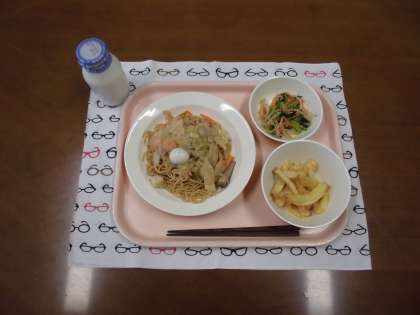 五目あんかけ焼きそば・牛乳・ナムル・フライドポテト です。
