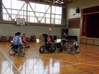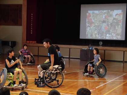 今年度は、オリンピック・パラリンピック教育の一貫として、元車いすプロバスケットボール選手の堀江航様をお迎えして、「人間のもつ無限の可能性や困難を乗りこえる力の育成」について、ご講演をいただき、貴重な機会となりました。5・6年生の子どもたちの代表は、車いすに乗ってバスケットボールも体験しました。「失敗をおそれず、何にでも挑戦すること」の大切さを学びました。