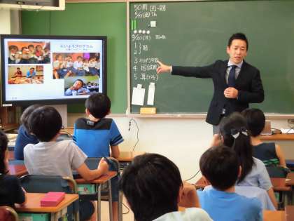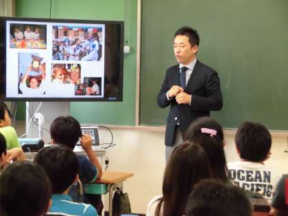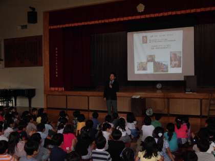 日本の方々の力で、ネパールにヒマラヤ小学校をつくり、子どもたちに健康教育や学習を支援している吉岡大祐様をお迎えしました。全校朝会や2年生と6年生に、ネパールの子どもたちの様子やネパールの国のことなどの話をしていただきました。日本の国と大きく違うことに子どもたちは、心動かされました。