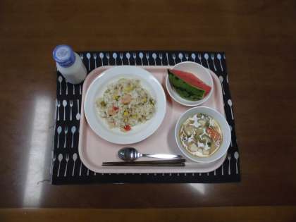 ナシゴレン・牛乳・麻婆汁・果物(小玉スイカ) です。