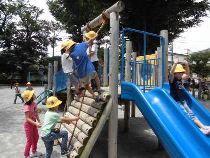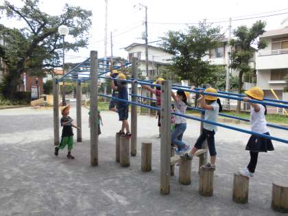 公園での遊び方のルールをみんなで確認した後は、思い切り体を動かして、汗びっしょりになるまで遊びました。