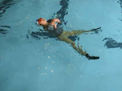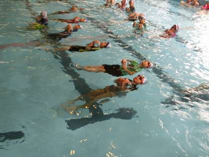 水の中に落ちた時は手足をなるべく動かさずに、顔を水から浮かせて体力を温存すること、ペットボトルなどを使用して浮くことなどを学習しました。