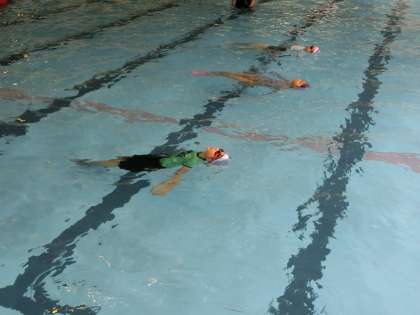 海や川での水の事故を想定しながら、水着の上に着衣の状態でプール指導を行いました。水着のみの状態と着衣の状態では重さが全くちがい、子どもたちは着衣の状態で水に入ると重くなることを実感しました。