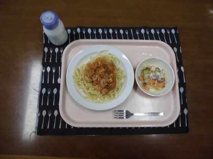 スパゲティー地中海ソース・牛乳・シーザースサラダ です。