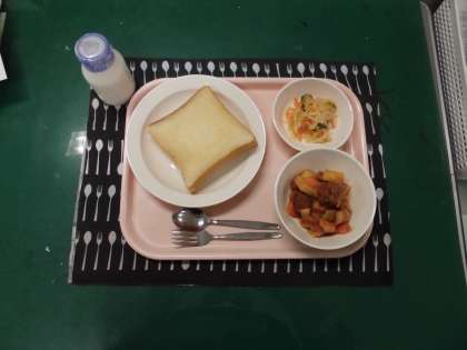 バタートースト・牛乳・いかとミートボールのトマト煮・