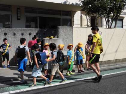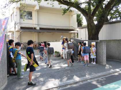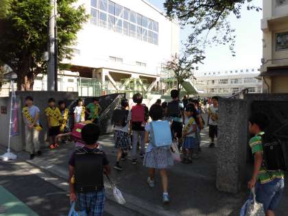 7月から毎週月曜日に始まった登校班によりあいさつリーダー。見本となる立派な態度で、あいさつを交わしています。