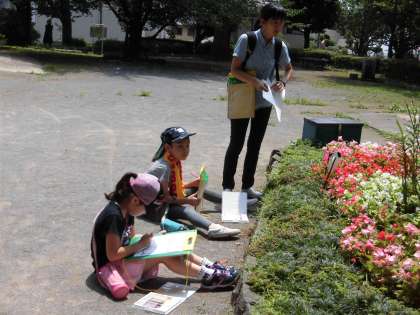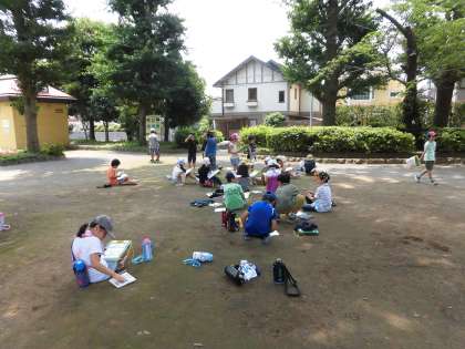 学校周辺のまちの様子を見たり、下馬中央公園に行き、生き物や植物を見つけたりしました。