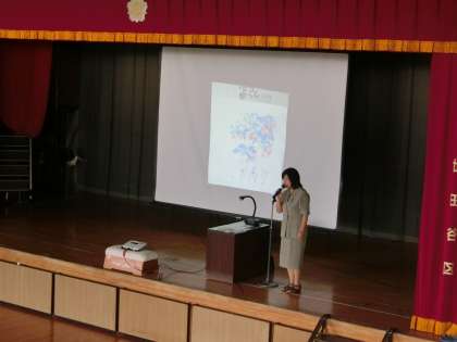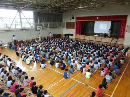今日の全校朝会は体育館で行いました。校長先生から「パラリンピック」についての話がありました。詩の紹介から始まり、パラリンピックについてみんなで一緒に考えました。